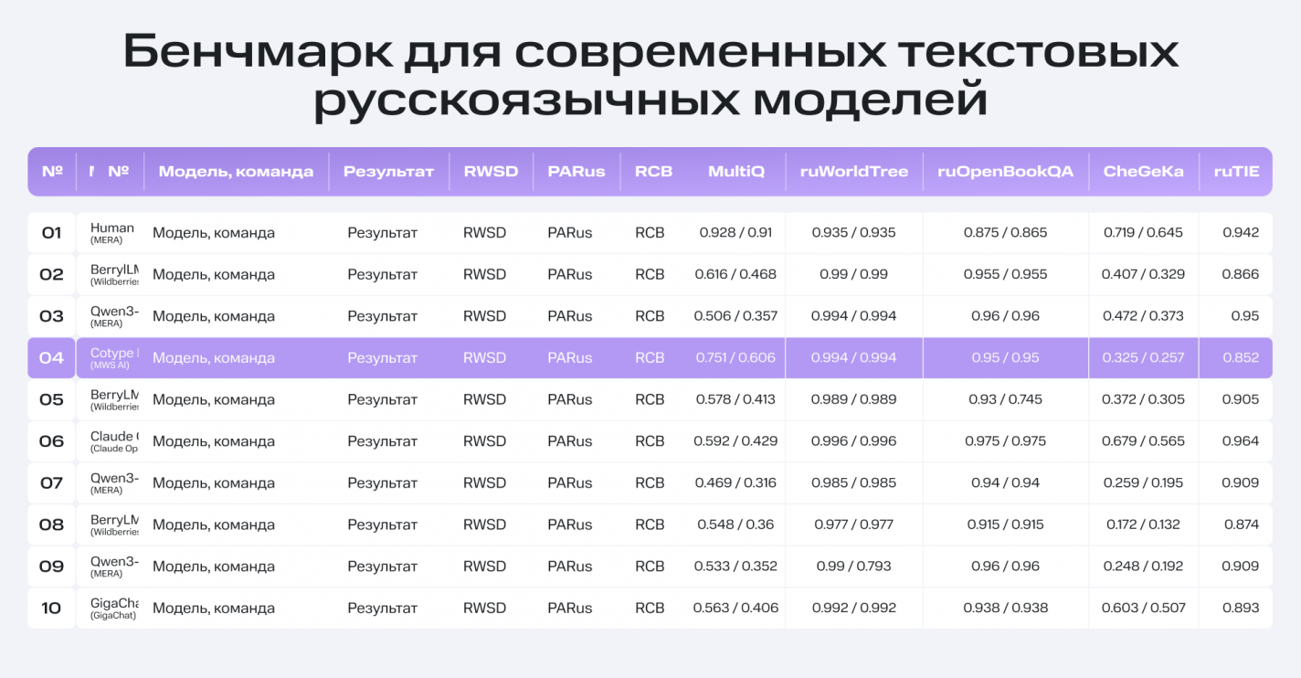 По данным независимого бенчмарка MERA (разработан Альянсом в сфере ИИ, оценивает языковые модели по широкому спектру задач на русском языке), Cotype Light 3 стала первой компактной моделью в топ-3 за всю историю рейтинга, набрав 0,792 балла из 1,0. Это лучше большинства моделей, работающих с русским языком, — в том числе тех, которые содержат 100+ миллиардов параметров и требуют кратно больше вычислительных мощностей. В задачах на математику и «знания о мире» — географию, историю, науку, культуру — точность модели превышает 99%.